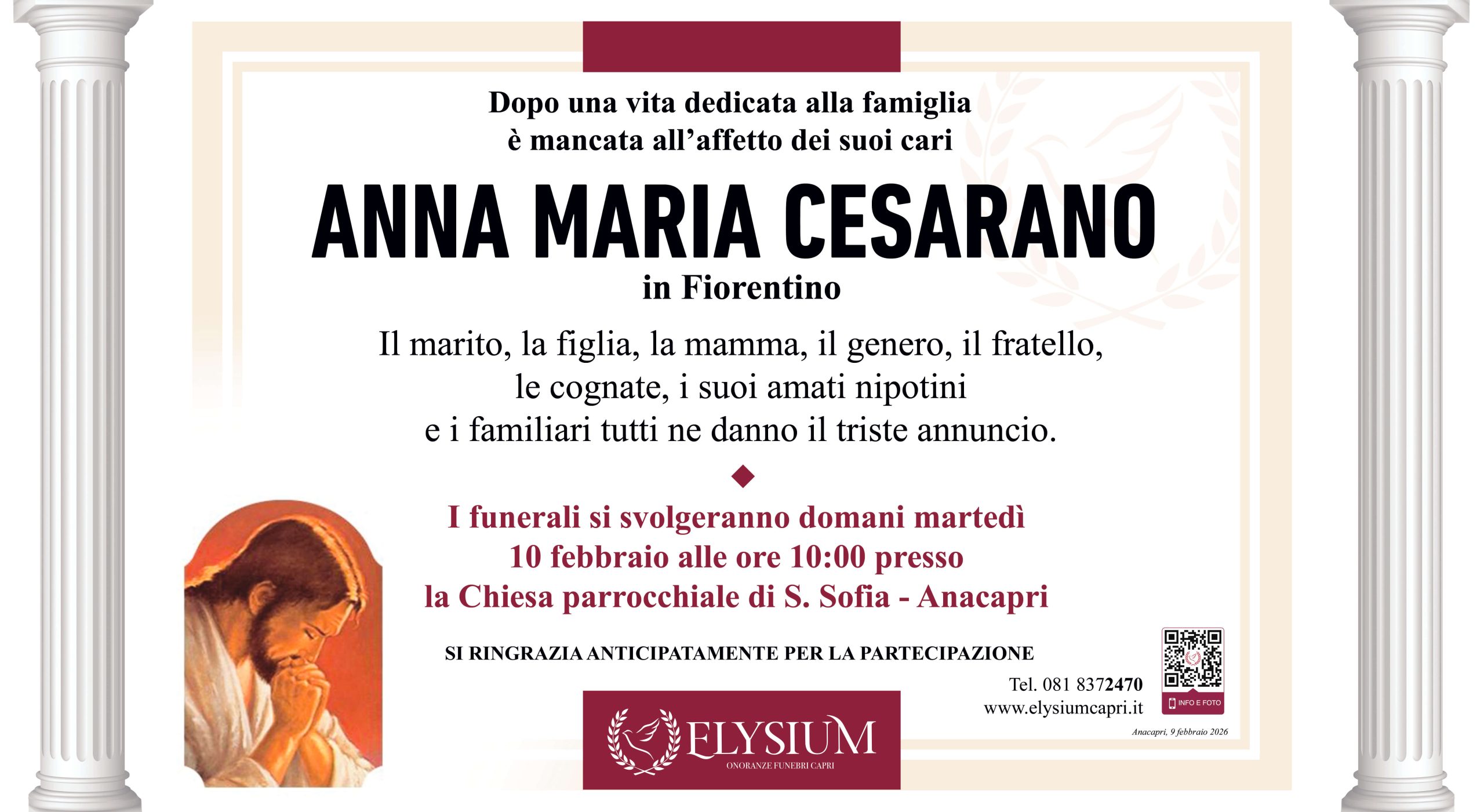 I funerali si svolgeranno domani martedì 10 febbraio alle ore 10:00 presso la Chiesa parrocchiale di S. Sofia - Anacapri